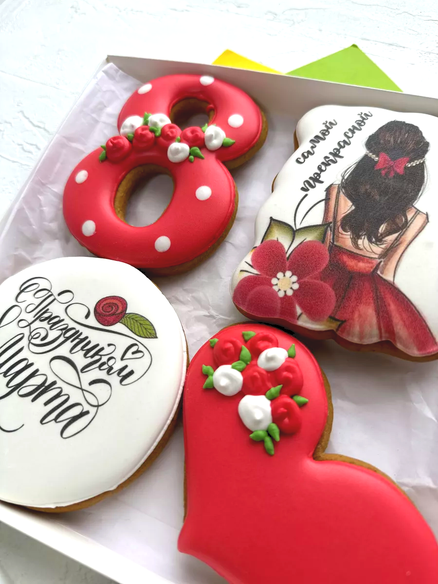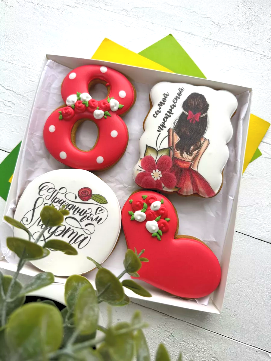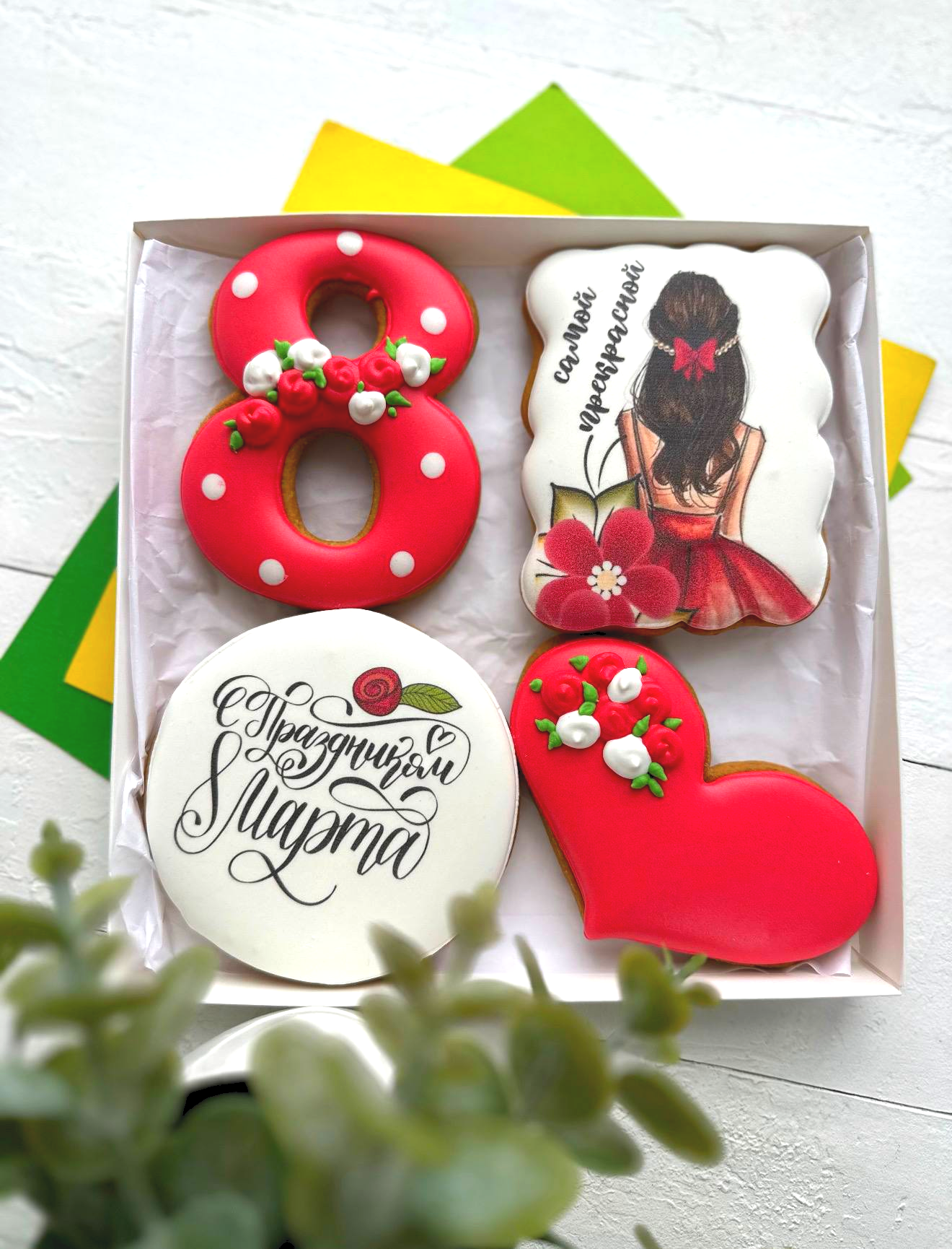 Подарочный набор красивых имбирных пряников на 8 марта - это сладкий подарок как для детей, так и для взрослых. Набор сладостей отлично подойдет для угощения на утренник в детский сад, школу, на праздничный стол дома и на работе. Замечательный вариант корпоративного подарка для женщин на Международный женский день. Наши пряники в глазури порадуют Вас приятным вкусом и ароматом, идеальное дополнение к чаю, кофе, какао, молоку. Вкусный бокс и оригинальный набор - именно то, что нужно, если вы не знаете, какой сделать подарок на восьмое марта. Фигурные пряники запакованы в красивую подарочную коробку с лентой. У нас есть разные варианты, вы обязательно найдете свой идеальный набор! Подойдет для подарка любой женщине, подруге, девушке, любимой, коллеге, сестре, девочке, племяннице, внучке, дочке, жене, маме, бабушке, учительнице, учителю, преподавателю, начальнице, директору. Глазированные пряники имеют натуральный состав и изготовлены нашими кондитерами вручную. Каждый пряник упакован в индивидуальный герметичный пакет, что гарантирует его свежесть. Продукт сертифицирован.